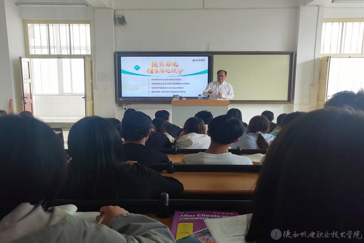 4月21日下午,陕西机电职业技术学院党委书记伊逊智在宝福路校区第二教学楼207教室为23动漫制作、21动漫五年1、2合班90余名学生讲授形势与政策课《加快建设社会主义文化强国》专题内容。